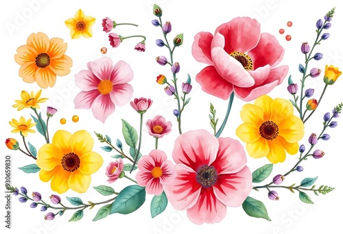 Colorful assortment of various flowers illustration including roses, daisies, and other blooms with green foliage on a white background