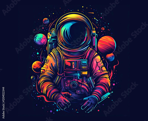 Colorful astronaut exploring space surrounded by vibrant planets and stars in a cosmic setting