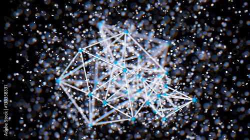Colorful atom grid plexus shape, blur bokeh defocused on black background