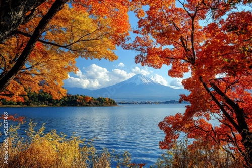 Colorful autumn fall foliage at Kawaguchi Lake with mount Fuji as the background in Japan