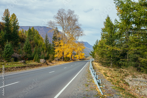 Colorful autumn landscape with birch tree with yellow leaves in sunshine near mountain highway. Bright alpine scenery with mountain road and trees in autumn colors. Highway in mountains in fall time.