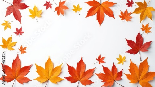 Colorful autumn leaves and seasonal decorations creatively arranged on white background with empty center for text