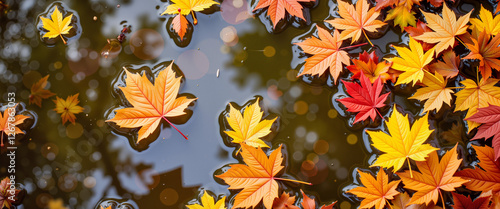 Colorful autumn leaves floating on water surface, tranquil nature