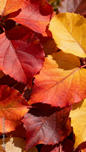 Colorful autumn leaves in rich red, orange, and yellow tones densely layered on the ground, showcasing the warmth and beauty of fall season with vibrant foliage and natural texture.Generated by AI