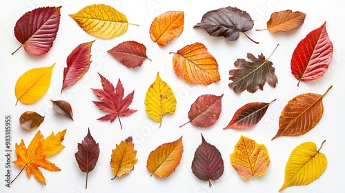 Colorful autumn leaves of various shapes and sizes lie scattered across a white background, creating a vibrant and eye-catching display.