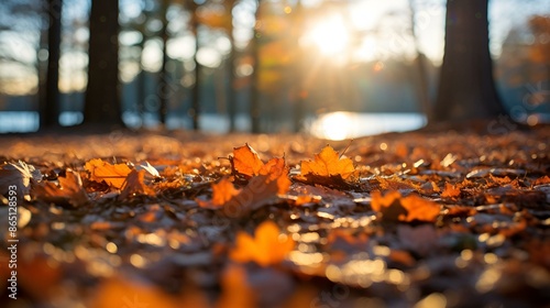 Colorful autumn leaves scattered on the ground by a serene lake.