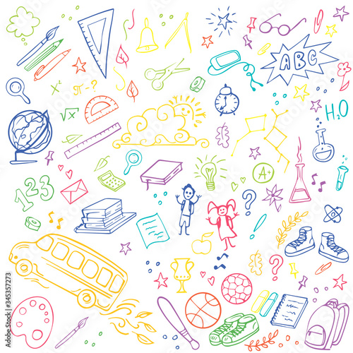 Colorful Back to school doodles set. Vector illustration. Perfect for textile fabric design, wrapping paper and website wallpapers.