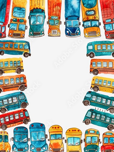 Colorful Back to School Frame Background with Watercolor School Buses - Perfect for Educational and Kids' Projects