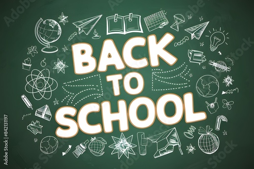 Colorful BACK TO SCHOOL with educational symbols on green chalkboard background