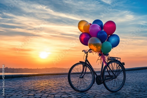 Colorful balloon bunch tied to classic bicycle at sunset by the river vibrant scene captured serene outdoor environment photography viewpoint joyful concept