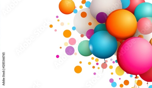 Colorful balloons and confetti on white background. Celebration, party, festive, joyful, vibrant, bright, happy. Perfect for birthday, anniversary