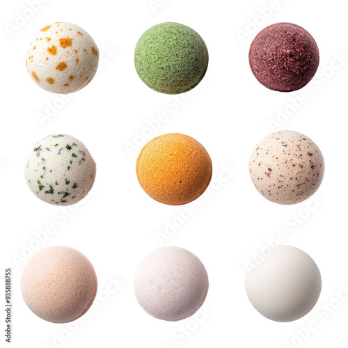 Colorful bath bombs arranged in a grid isolated on a white background.