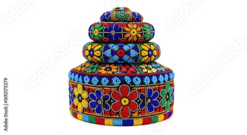Colorful Beaded African Basket Tower Isolated on White Background