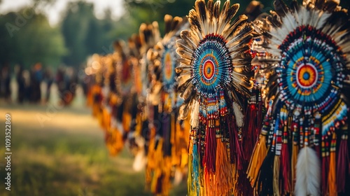 Colorful beaded and feathered Native American headdresses displayed in a row.