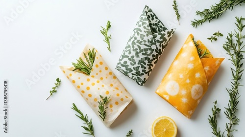 Colorful Beeswax Food Wraps with Herbs on White Background