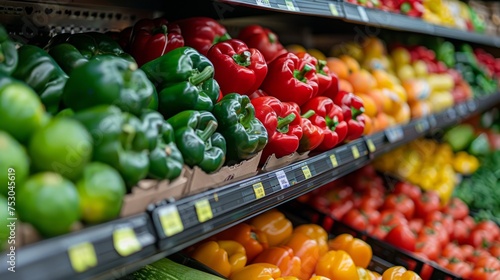 Colorful bell peppers neatly arranged and displayed on supermarket shelves Vibrant shades of red and yellow chilies invite customers to choose the chili of their choice.