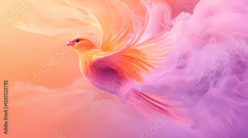 Colorful bird flying through dreamlike pink and orange smoke