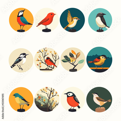 Colorful Bird Icons Set, Various Songbirds, Birdwatching Concept Art