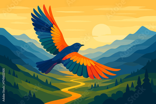 Colorful bird soaring over mountain landscape at sunset in a serene natural setting