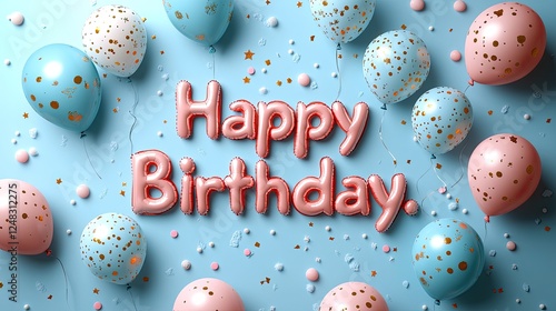 Colorful birthday celebration scene featuring balloons and confetti on a blue background