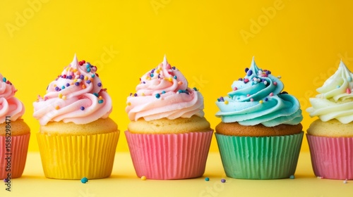 Colorful birthday cupcakes with frosting and sprinkles arranged on bright yellow background for party celebration or festive event decoration
