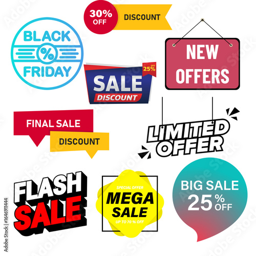 Colorful Black Friday and Seasonal Sale Labels with New Offers for Marketing