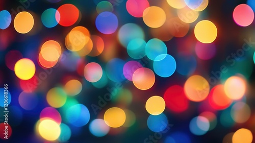 Colorful blurred bokeh lights in blue, red, and yellow, abstract festive celebration background.