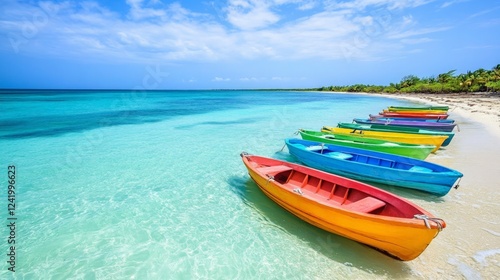 Colorful Boats Resting on Serene Tropical Beach Under Blue Sky