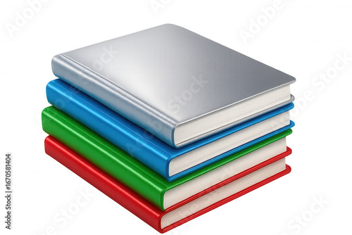 Colorful books stacked vertically, metallic cover gleaming, representing learning potential on minimalist transparent background