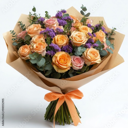Colorful bouquet of gerbera daisies and lavender wrapped in brown paper