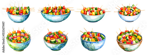 Colorful bowls of fresh, vibrant salad with skewers, perfect for a healthy meal.