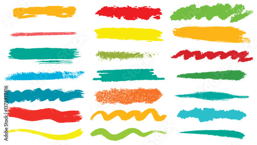 Colorful bright textured brush strokes. Crayons lines, kids set. Hand drawn paint highlighter, underline, mark, underline. Vector graphics
