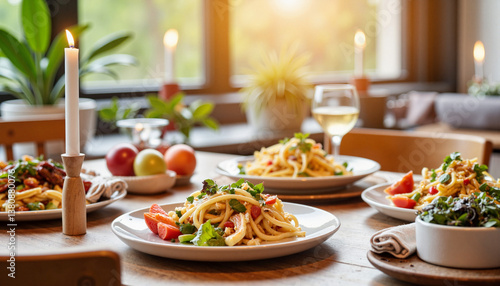 Colorful brunch spread on candlelit table in modern dining area, weekend delight