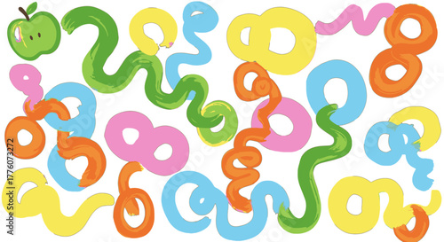 Colorful brush strokes and playful shapes create a whimsical and vibrant composition on a white.