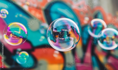 Colorful bubbles floating in front of a vibrant graffiti wall, creating a playful and artistic urban scene