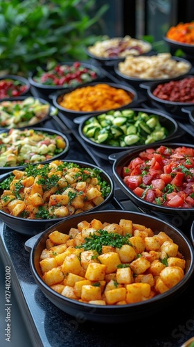 Colorful Buffet Display Of Salads And Roasted Potatoes