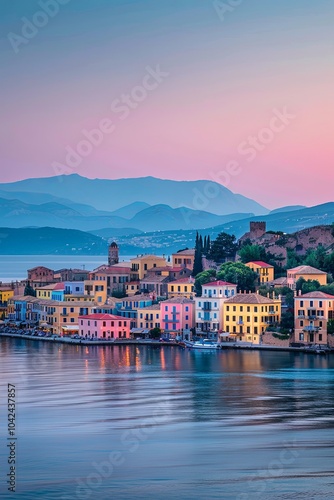 Colorful buildings along the coast of a bay with a pink sunrise in the background.