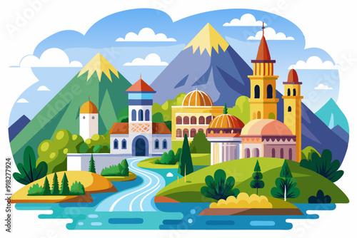 Colorful Buildings and Mountains Surrounding a Winding River