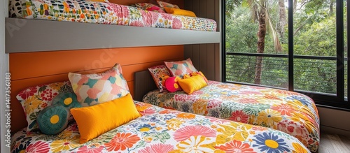 Colorful Bunk Beds with Lush Forest View