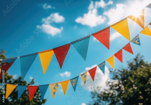 Colorful Bunting Flags Hanging Against a Bright Blue Sky with Fluffy Clouds and Sunlight Shining Through for Celebration and Festivity Themes
