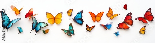 Colorful Butterflies in a Garden, vibrant butterflies gracefully moving among blooming flowers, showcasing nature's beauty against a soft, serene white backdrop