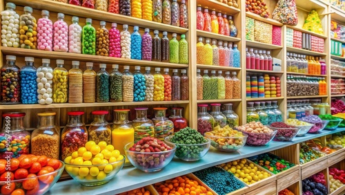 Colorful Candies and Snacks in Glass Jars on Wooden Shelves, turkish delight, candy store, sweet treats, dessert shop