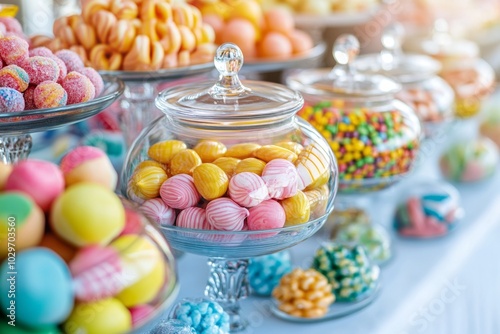 Colorful candy buffet display featuring assorted jars filled with sweets and treats at a festive celebration