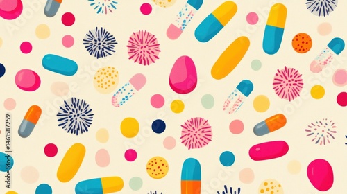 Colorful capsules and bacteria pattern.