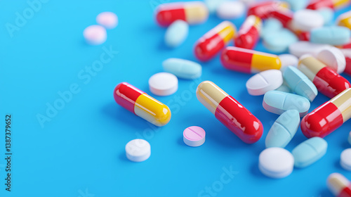 Colorful capsules and tablets scattered blue background, showcasing various shapes and sizes of medication. vibrant colors create engaging visual