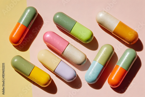 Colorful capsules arranged on a pastel background create an eye-catching visual of modern wellness products