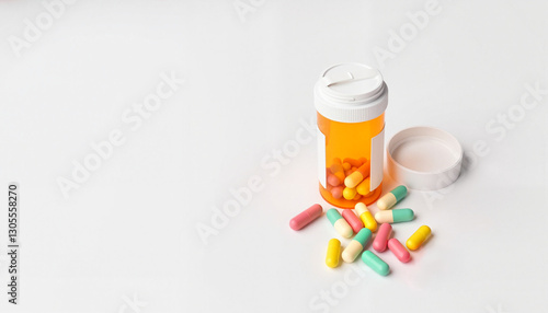 Colorful capsules spilling from orange pill bottle on clean background, health