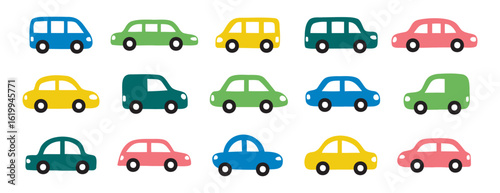 colorful cars set. Cute icons collection hand drawn doodle style for design of children kids room, clothes, fabric