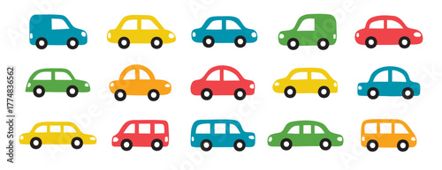 colorful cars set. Cute icons collection hand drawn doodle style for design of children kids room, clothes, fabric