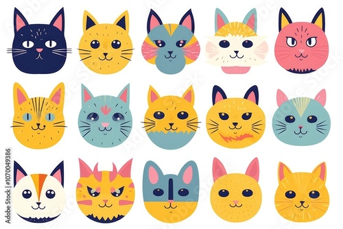Colorful cartoon cat faces with diverse expressions and vibrant designs